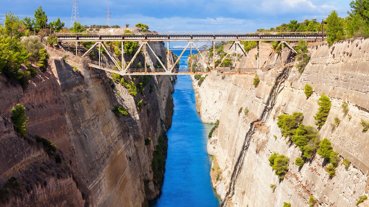 The idyllic return road starts at the impressive bridge of Rio-Antirio. A last stop at the Corinth Canal with the breathtaking view brings the road trip to a close.